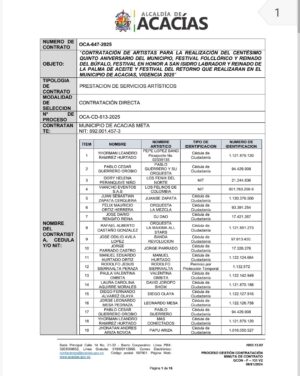 En Acacías crece la indignación ciudadana tras conocerse los detalles del contrato OCA-647-2025, mediante el cual la alcaldía destinó la millonaria suma de $3.447.500.000 para la contratación de artistas en el marco del Festival del Retorno 2025 y demás celebraciones culturales del municipio.